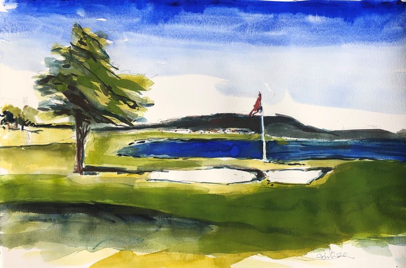 Combine a dramatic coastline and mystical forest with a rich history of world-class accommodations, warm hospitality, expert service and grand recreation. … It’s no wonder Pebble Beach Golf Coursehas attracted extraordinary visitors throughout the history of Pebble Beach. From Samuel F. B. Morse to Clint Eastwood. Teddy Roosevelt to Sir Winston Churchill. This watercolor depicts the famous 18th hole at Pebble Beach. From there it's off to the Clubhouse!!