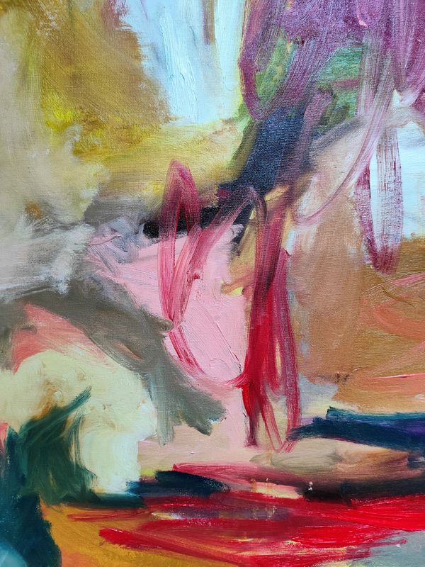 Abstract artwork in a warm and strong palette mainly red and orange. Worked in several layers with gestural and energic brush strokes. Positive energy. The edges are painted in the continuity of the work.